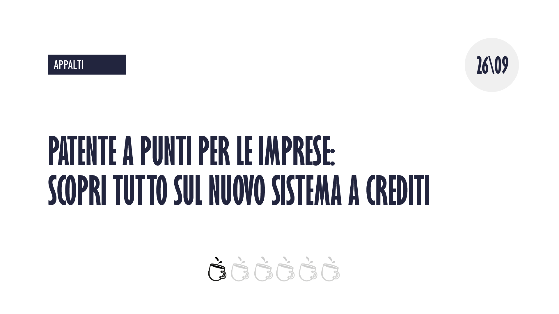 Il primo ottobre entre in vigore la patente a punti. Un vero e proprio sistema di qualificazione delle imprese e dei lavoratori autonomi che operano per cantieri temporanei o mobili sia negli appalti privati che in quelli pubblici. Non perdete l’occasione di prepararvi al meglio per questa importante novità che segnerà il futuro degli appalti e della sicurezza nei cantieri.